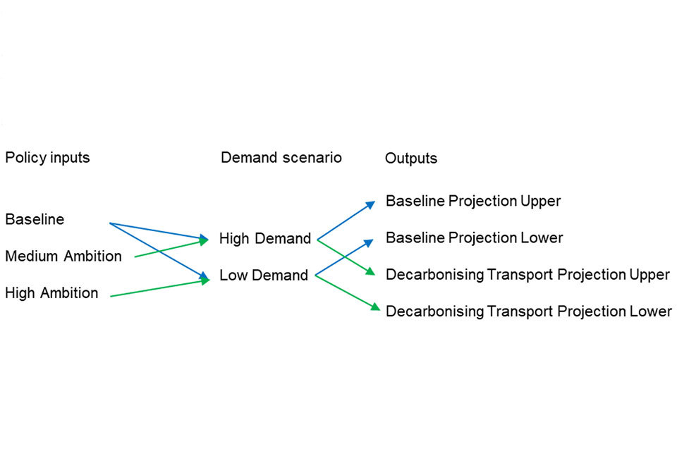 Baseline and policy projections were created for the decarbonising transport projection in the following way:
