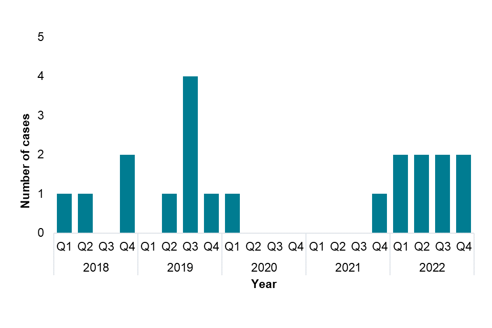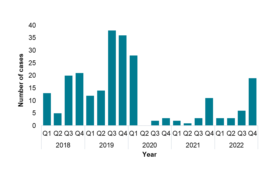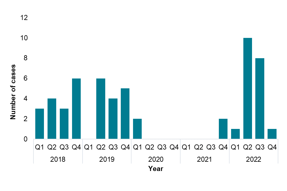 Between 2015 and 2019 there were an average of 15 cases each year in EWNI, with a peak of 17 cases in 2018. There were 20 cholera cases reported in 2022, all of which were reported in England. This was a large increase compared to 2021 where 2 cases were reported. Case numbers were highest in the second and third quarters (n=10 and n=8) (Figure 4).