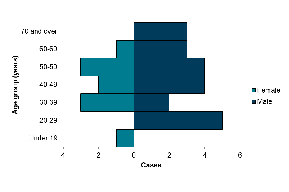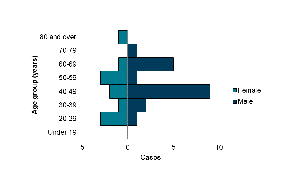 In 2022, 10 cases (32%) were female (aged 17 to 68 years, median=45) and 21 (68%) were male (aged 21 to 76 years, median=48) (Figure 11).