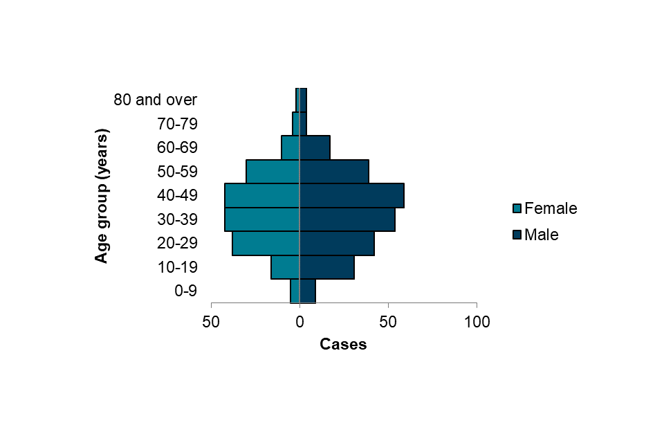 In 2022, 11 cases (36%) were female (aged 25 to 82 years, median=44) and 19 (61%) were male (aged 26 to 70, median=49) (Figure 3). Sex was not recorded for 1 case.