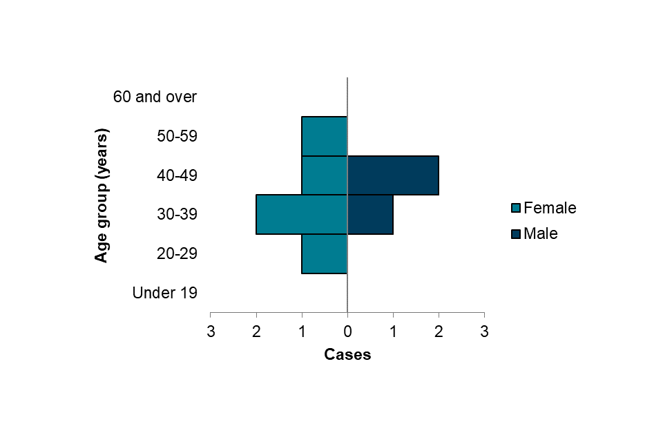 In 2022, 5 cases (63%) were female (aged 26 to 52 years, median=33) and 3 (37%) were male (aged 33 to 45, median=44) (Figure 17).
