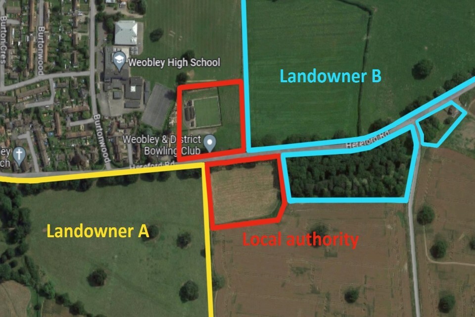 Image 1 shows ash trees on land owned by separate landowners. The areas marked in yellow belong to a private landowner (A). The areas marked in blue belong to a private landowner (B). The areas marked in red belong to the council.
