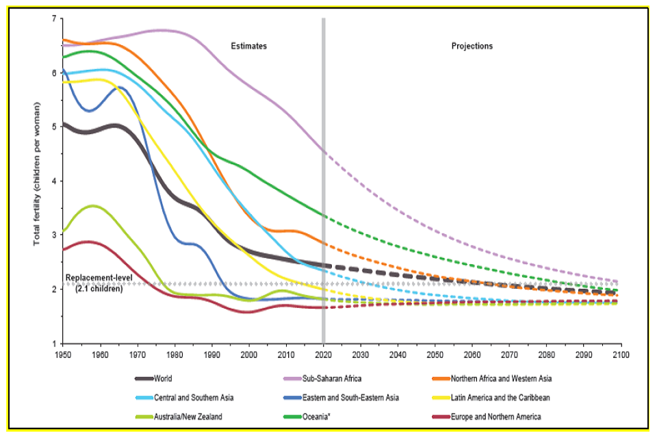 2. Decreasing total global fertility, falling below natural replacement levels