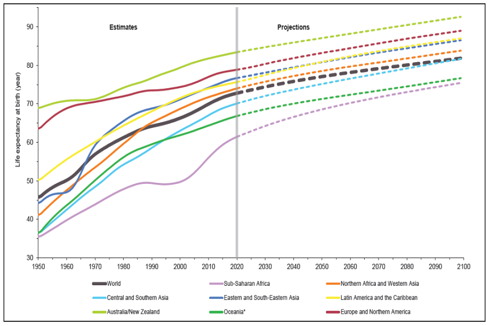 Line graph of life expectancy at birth in years from 30 to 90 over the time period 1950 to 2100.