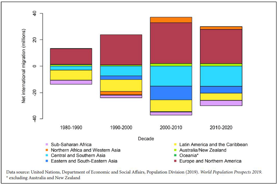 Bar chart of net international migration in millions over four 10 year time periods from 1980 to 2020.