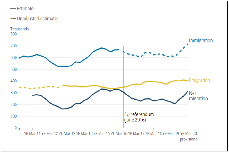 In the year ending March 2020, long-term international migration continued to add to the UK population. Current best estimates show that around 313,000 more people moved to the UK with an intention to stay for 12 months or more than left the UK (net migration). Between 2016 and 2019, long-term net migration, immigration and emigration have remained broadly stable. Data from 2019, prior to the coronavirus (COVID-19) pandemic, suggests that migration is changing with an increase driven by non-EU citizens arriving to study in the UK.