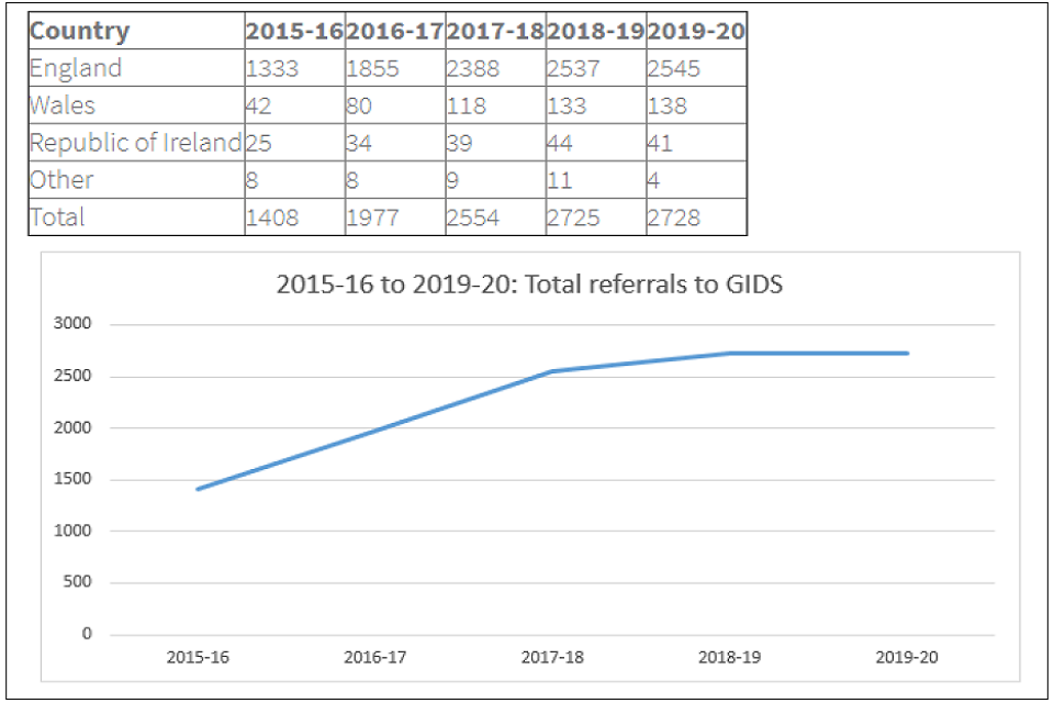 Table and line graph showing number of referrals to the Gender Identity Service over the period 2015-16 to 2019-20.