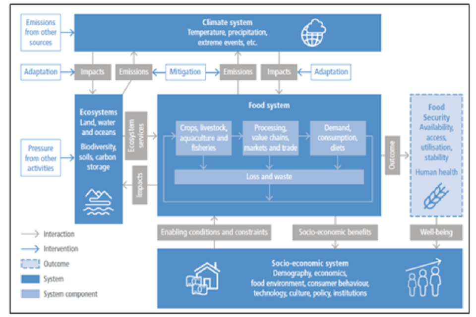 Interlinkages between the climate system, food system, ecosystems (land, water and oceans) and socio-economic system. These systems operate at multiple scales, both global and regional. Food security is an outcome of the food system leading to human well-being, which is also indirectly linked with climate and ecosystems through the socio-economic system