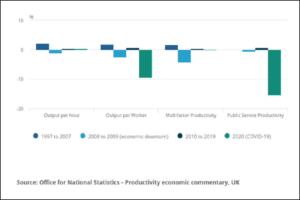 Bar graph of productivity from -20 to 10 in percentage over four time periods, 1997 to 2007 (mid blue), 2008 to 2009 (light blue), 2010 to 2019 (dark blue) and 2020 (green).