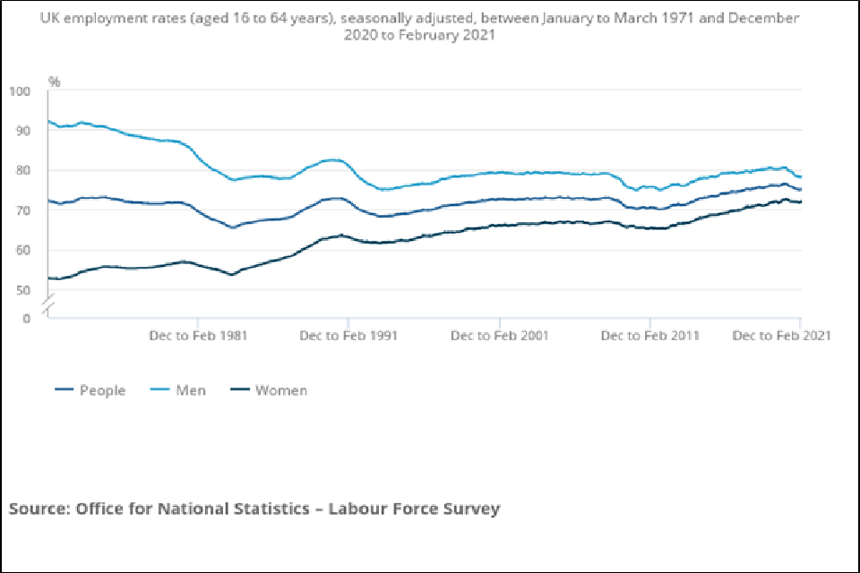 UK employment rates (aged 16 and 64 years, seasonally adjusted, between January and March 1971 and December 2020 to February 2021