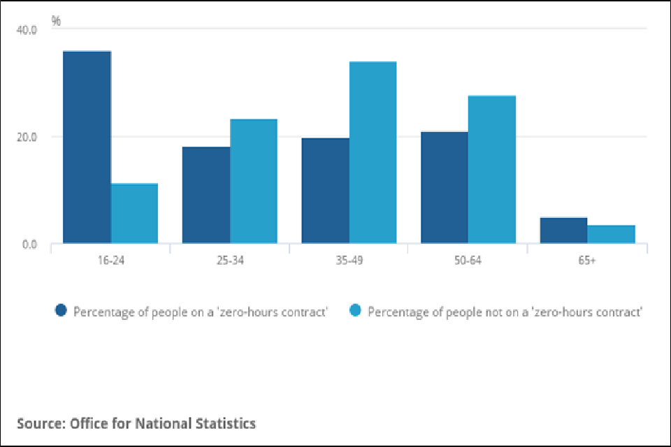 People on a zero-hours contract are more likely to be younger. In 2017, 36.0% of people on zero-hours contracts were aged 16 to 24 years, compared with 11.4% for all people in employment.