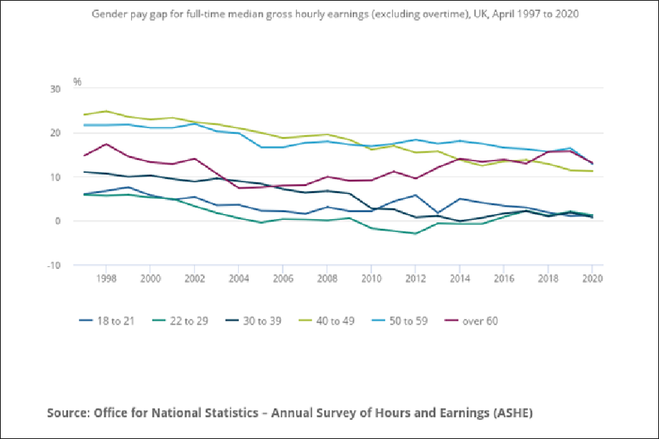 Line graph of gender pay gap as a percentage from -10 to 30, between 1998 to 2020. The mid blue line is ages 18 to 21; green line ages 22 to 29; dark blue line ages 30 to 39; lime green line ages 40 to 49; light blue line ages 50 to 59; red line over 60.
