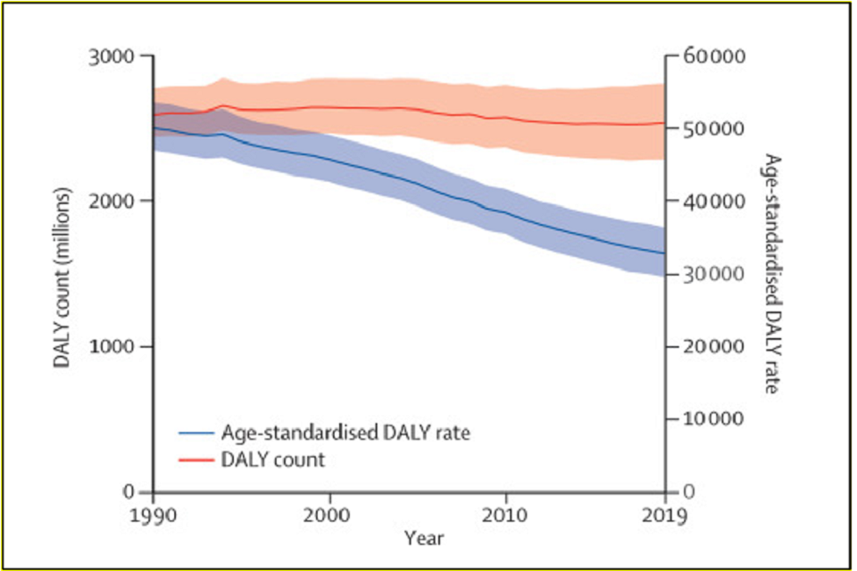 Between 1990 and 2019, the number of global DALYs remained almost constant, but once the effects of population growth and ageing were removed by converting counts to age-standardised rates, there were clear improvements in overall health. Decreases in age-standardised DALY rates have accelerated over the past decade in countries at the lower end of the Socio-demographic Index (SDI) range, while improvements have started to stagnate or even reverse in countries with a higher SDI.