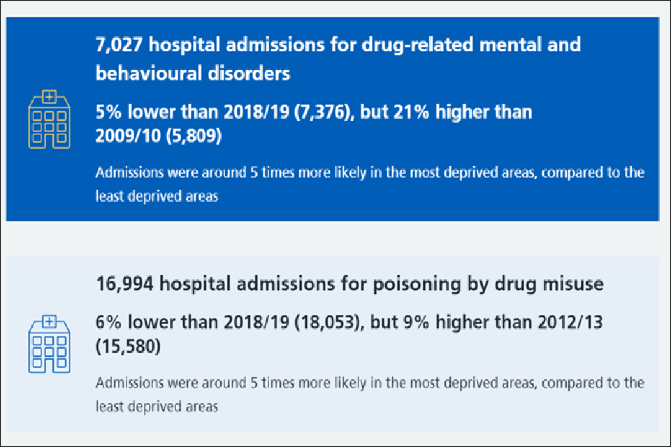 Infographic showing, in the dark blue box hospital, admissions for drug related mental and behavioural disorders. The light blue box has data for hospital admissions for poisoning by drug misuse.