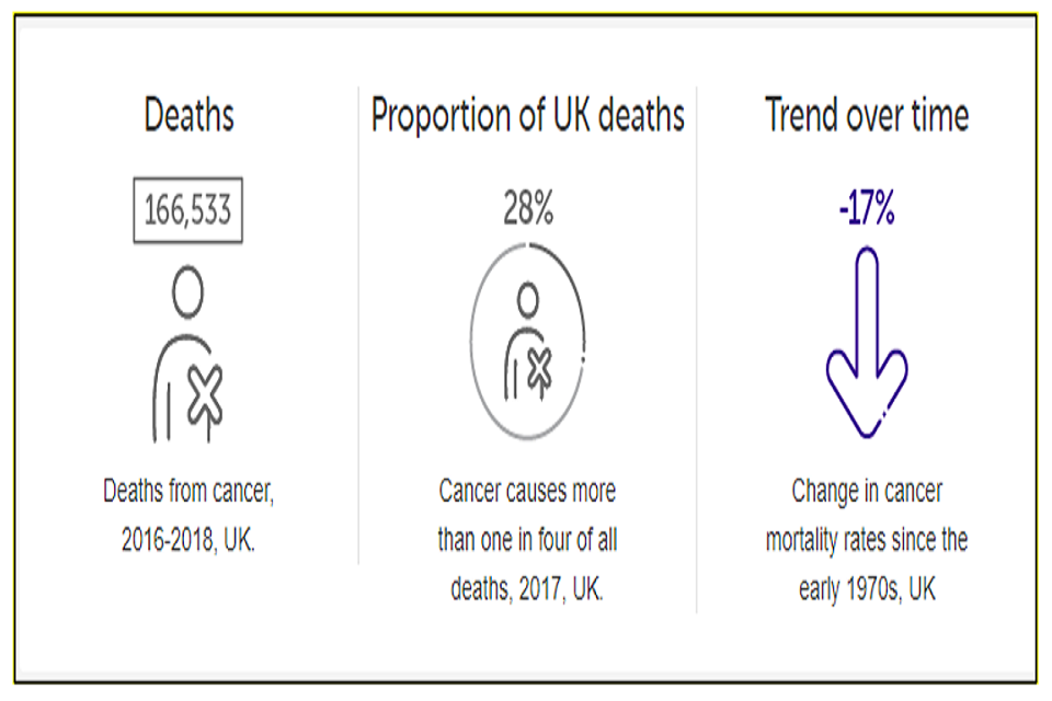 Infographic of deaths, proportion of deaths and trend over time for UK cancer rates.