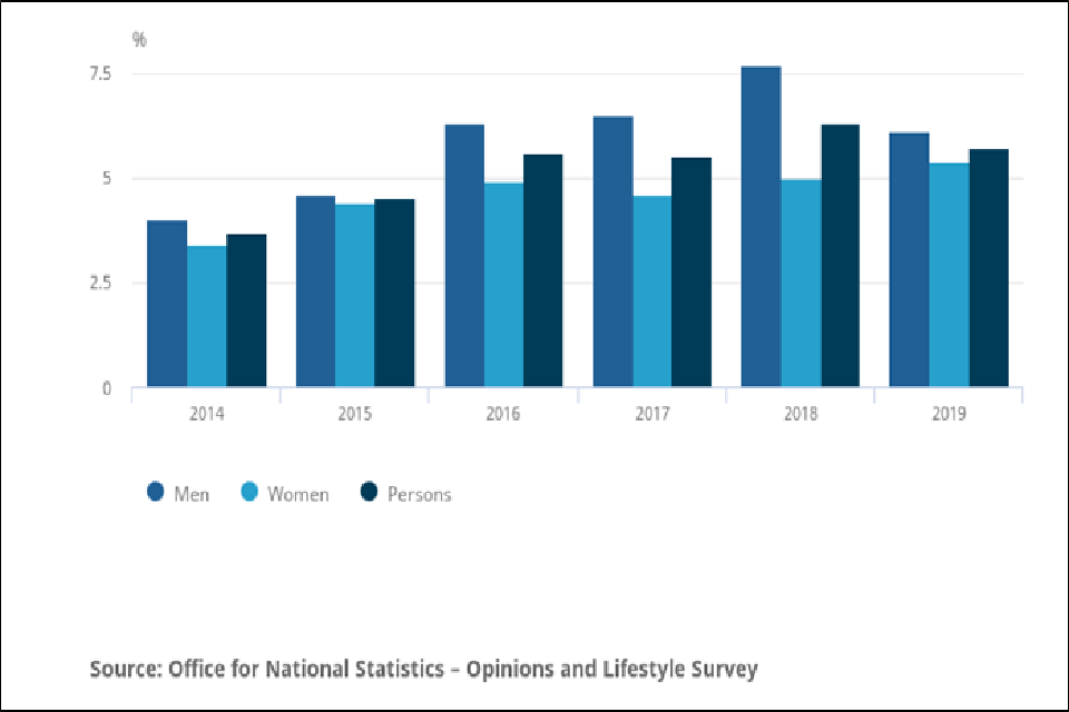 In Great Britain, 5.7% of respondents to the Annual Population Survey in 2019 said they currently used an e-cigarette, which equates to nearly 3 million adults in the population. This proportion is significantly higher than that observed in 2014, when data collection began, when only 3.7% vaped.
