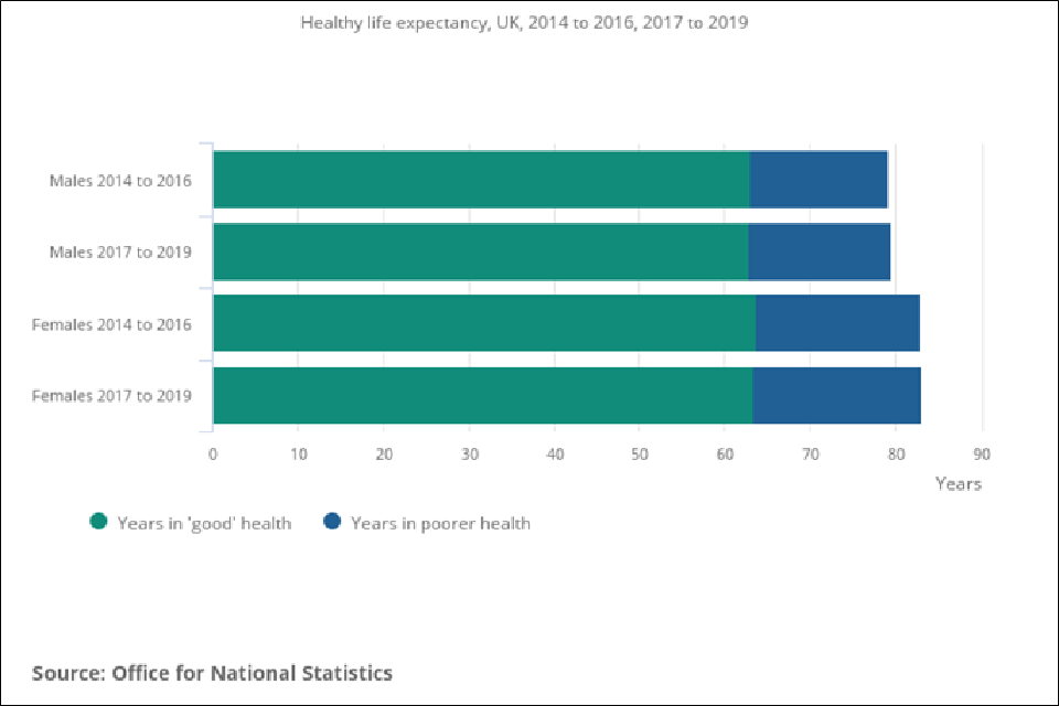 - Health state life expectancies, UK: 2017 to 2019, Office for National Statistics.
