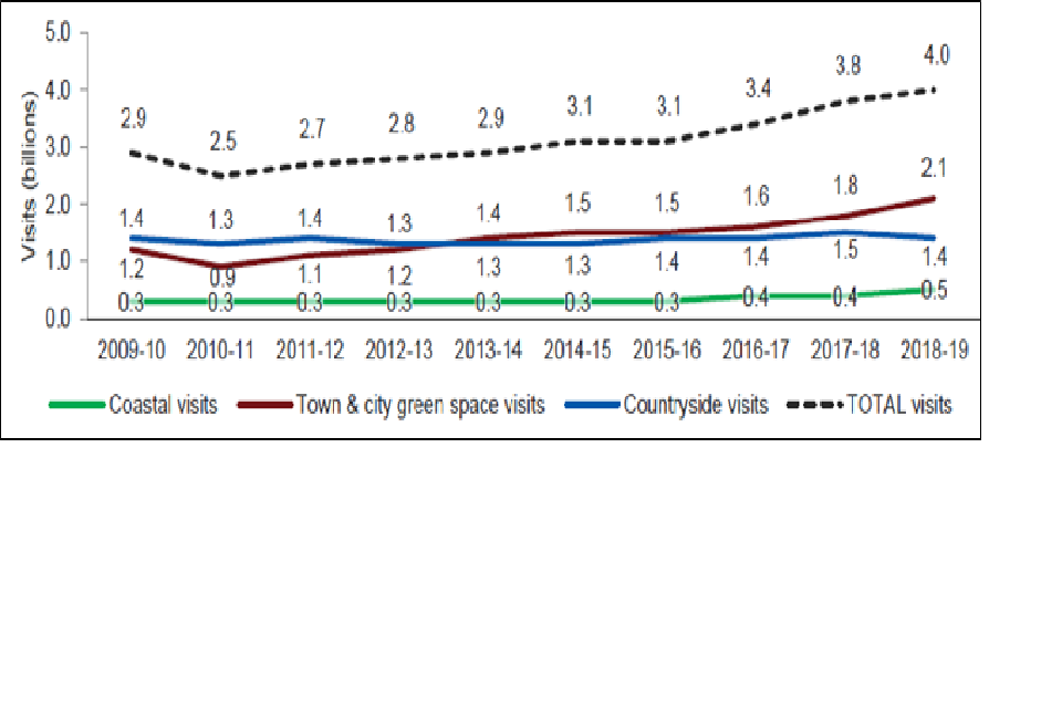Line graph of visits in billions over the time period from 2009 to 2010 to 2018 to 2019. The green line represents coastal visits, red line town and city green space visits, blue line countryside visits and hashed line total visits.