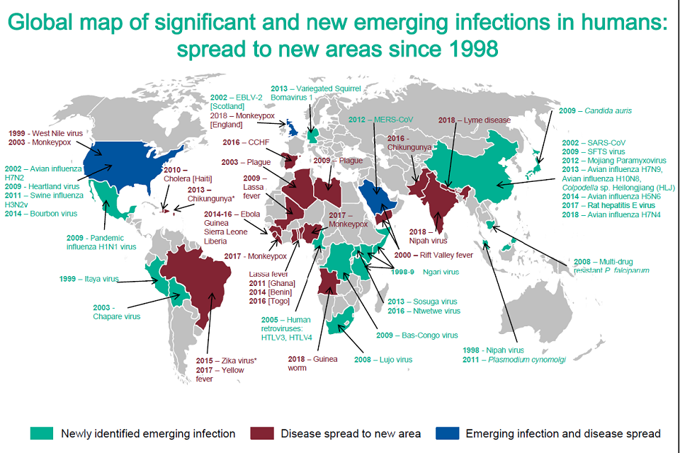 Global map of significant and new emerging infections in humans: to spread to new areas since 1998