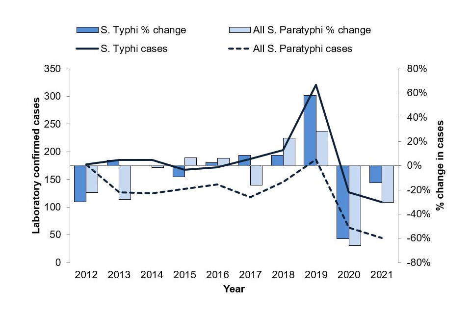 Figure 1. Laboratory confirmed cases of S. Typhi and S. Paratyphi, with % change year to year, England, Wales and Northern Ireland: 2012 to 2021