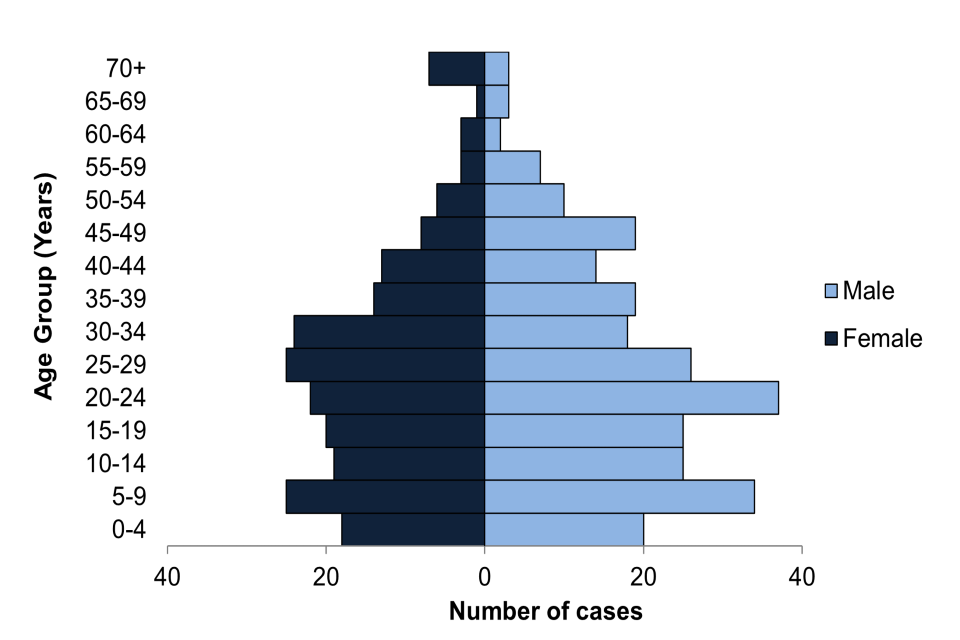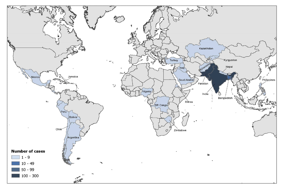 For those UK resident cases who did not visit friends and relatives (41 cases), where reason for travel was known this included holidays (29), business (4) and other, such as studying abroad (8). These cases travelled to a number of countries, including Pakistan (17), India (8), Bangladesh (3), and countries in the Americas (8), Asia (4) and Africa (one).