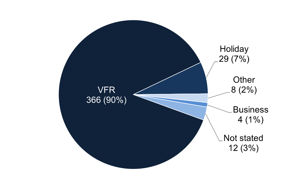 Figure 5. Reason for travel for laboratory-confirmed symptomatic cases of enteric fever that travelled abroad from England, Wales and Northern Ireland: 2022 (total 419 cases)