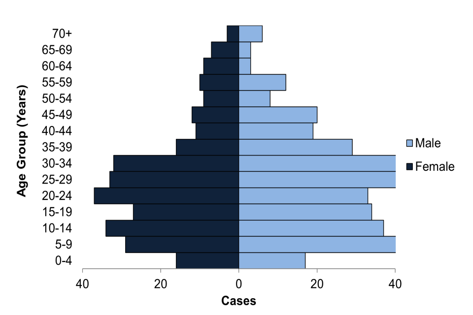 Figure 2. Laboratory-confirmed symptomatic cases of enteric fever, England, Wales and Northern Ireland by age and sex where sex is known: 2023 (total 645 cases)