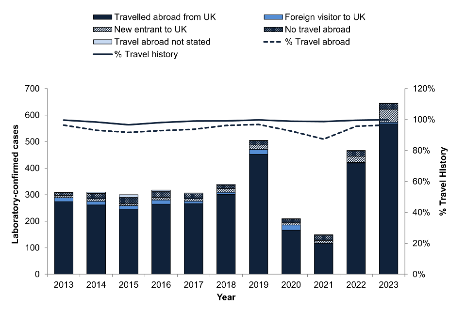 Figure 3. Laboratory-confirmed symptomatic cases of enteric fever, England, Wales and Northern Ireland by travel history: 2014 to 2023