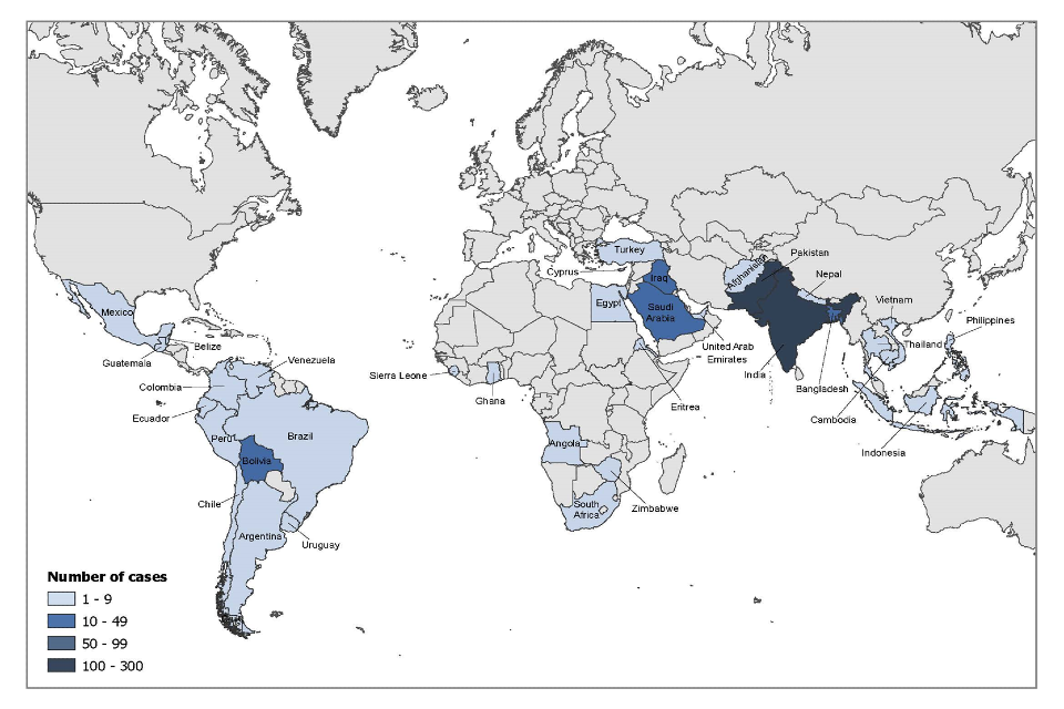 For those UK resident cases who did not visit friends and relatives (69 cases), where reason for travel was known the reasons provided included holidays (60), business (3) and other, such as studying abroad (6). These cases travelled to a number of countries, including India (25), Pakistan (16), and countries in the Americas (20), Asia (12), Africa (2) and Oceania (one), with some cases travelling to more than one country.