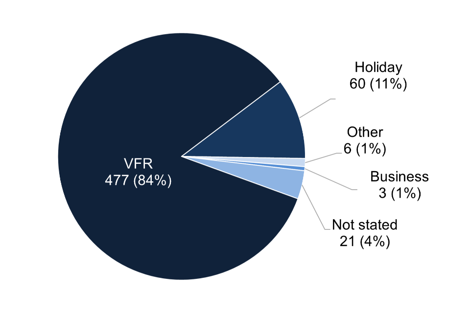Figure 5. Reason for travel for laboratory-confirmed symptomatic cases of enteric fever that travelled abroad from England, Wales and Northern Ireland: 2023 (total 567 cases)