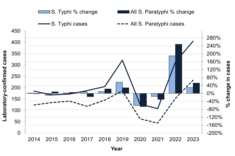 Figure 1. Laboratory-confirmed symptomatic cases of S. Typhi and S. Paratyphi, with % change year to year, England, Wales and Northern Ireland: 2014 to 2023
