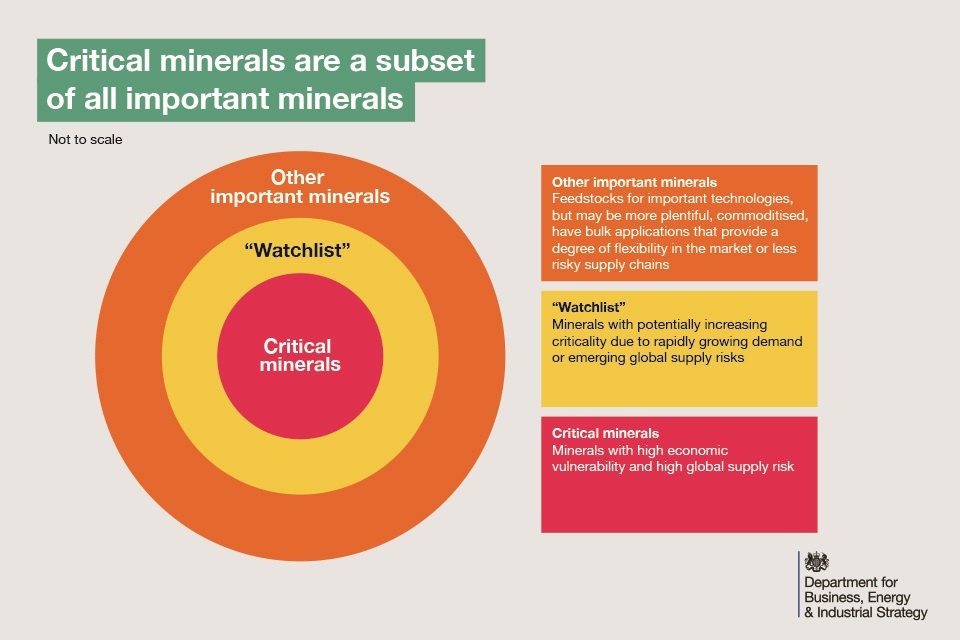 Critical minerals: Minerals of both high economic importance and high risk of supply disruption. For further information on how minerals are evaluated to be “critical”, see the UK criticality assessment of technology critical minerals and metals[footnote 32].