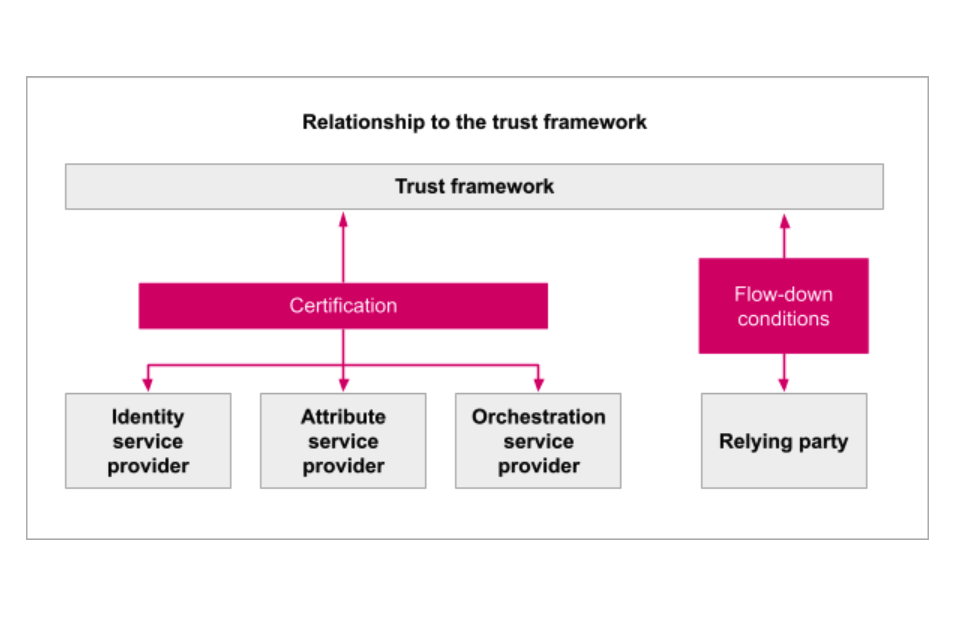 Relying parties do not need to be certified against the trust framework in order to adopt digital identities. However, it is vital that their practices reflect the principles behind the trust framework rules. Alpha version 2 of the trust framework included a commitment to define these behaviours through flow down terms. The beta version of the trust framework sets out these flow down terms and how they apply to organisations who have a relationship with trust framework organisations.