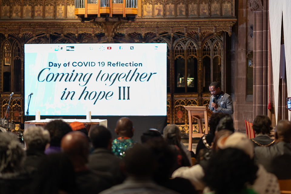 Digwyddiad Diwrnod Myfyrio COVID-19 2025, "Coming Together in Hope III," a gynhaliwyd yn Eglwys Gadeiriol Manceinion ar 9 Mawrth 2025. Credyd delwedd: Rhwydwaith Iechyd y Caribî ac Affrica