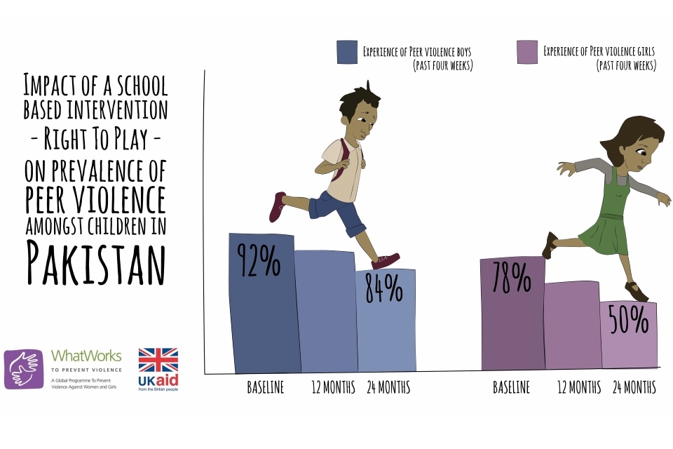 Shows how peer violence experienced by boys and girls was reduced over 24 months, as part of the ‘Right to Play’ programme in Pakistan. Boys’ experience of peer violence was reduced from a baseline of 92% to 84% 24 months later. Girls’ experience of peer violence was reduced from a baseline of 78% to 50% 24 months later.