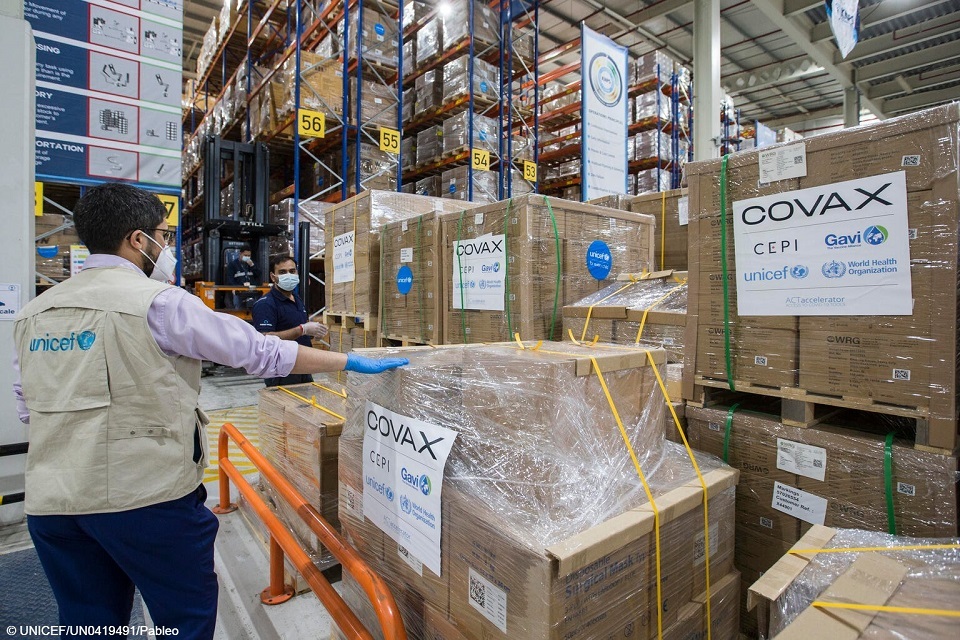 A shipment of syringes and safety boxes to support the country rollout of COVID-19 vaccines being processed in Dubai, 2021. Credit: UNICEF/Francis Kokoroko.