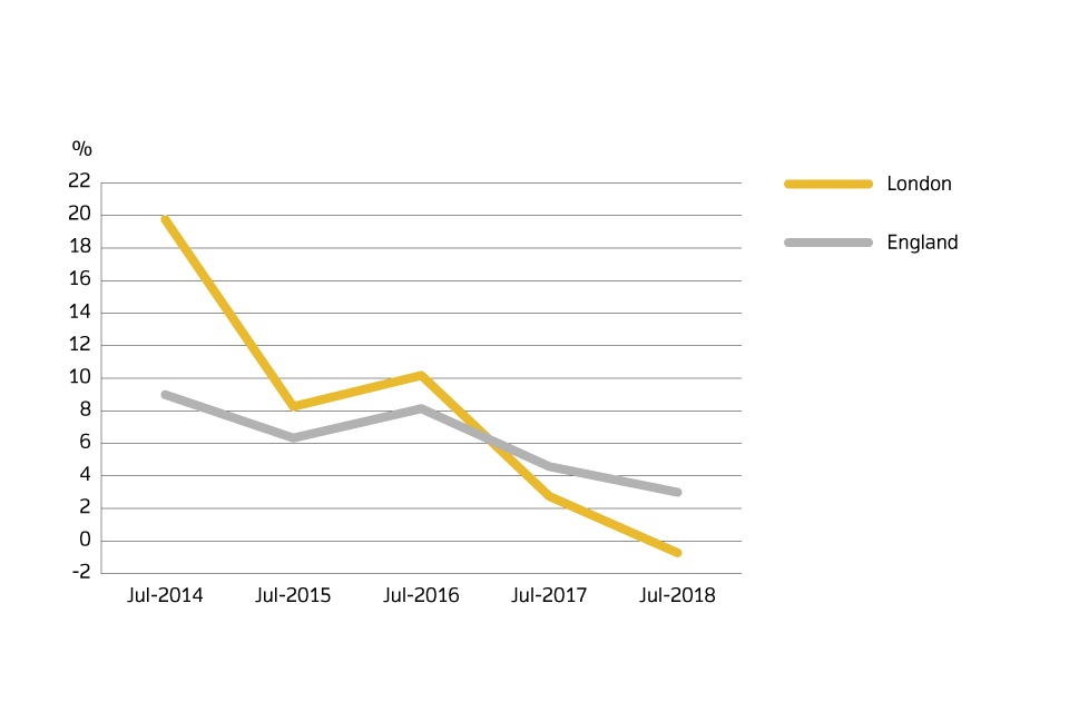 Average house prices in England have increased by 3.0% in the year to July 2018 (up from 2.9% in June 2018). In London, average house prices decreased by 0.7% in the year to July 2018 (following a rise of 0.3% in the year to June 2018).