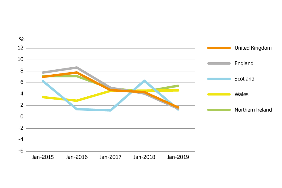 At the country level, the largest annual price growth was recorded in Wales, increasing by 4.6% over the year to January 2019.