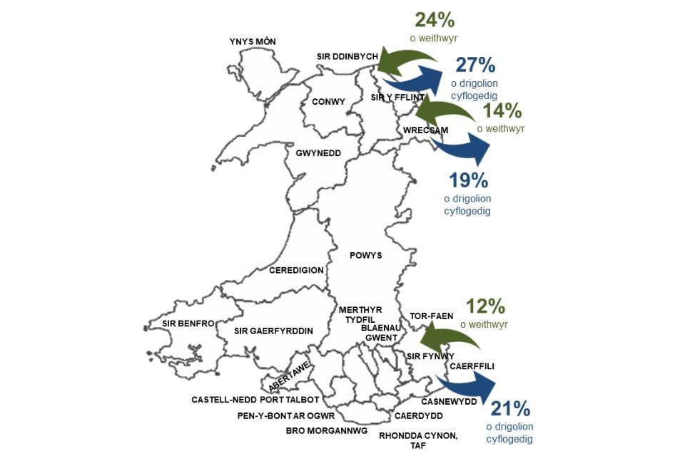 Ffigur 2. Cymudo ar draws rhanbarthau rhwng awdurdodau lleol yng Nghymru a Lloegr[troednodyn 3]