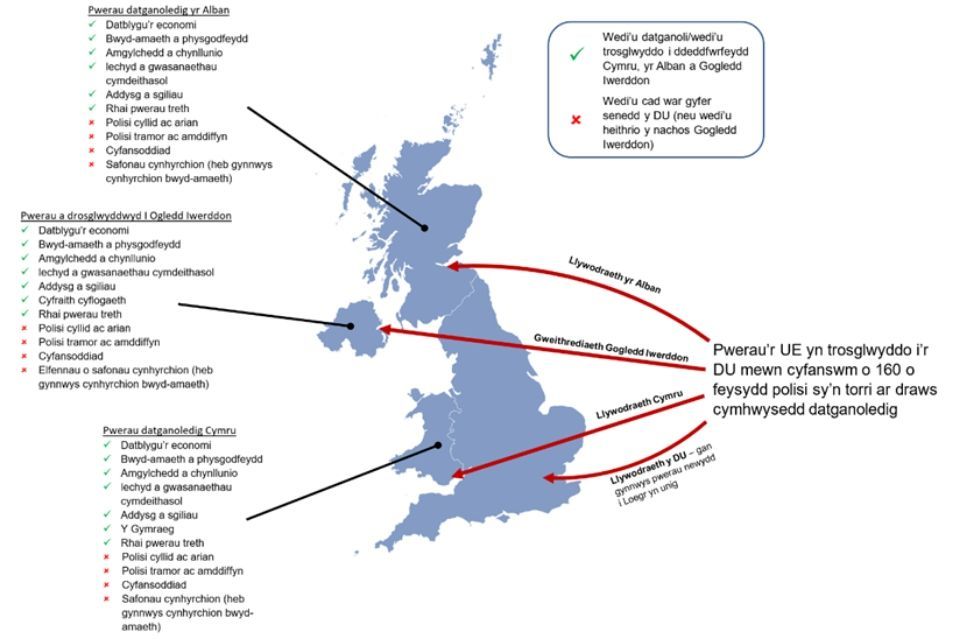 Ffigur 1. Enghreifftiau o feysydd o gymhwysedd datganoledig a swm y pwerau newydd sy’n trosglwyddo i’r gweinyddiaethau datganoledig[troednodyn 1]