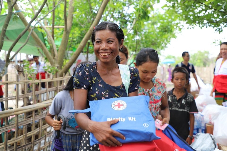 In Rakhine State, a woman impacted by Cyclone Mocha receives a dignity kit from Myanmar Red Cross volunteers in May 2023 as part of an IFRC Disaster Response Emergency Fund operation to support more than one million affected people. Photo: Myanmar Red Cross Society.