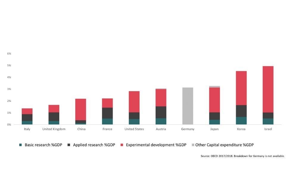 Bar chart showing the breakdown of basic research, applied research and experimental development as % of GDP for different countries. The UK total % of GDP is 1.7% which is low compared to other countries.