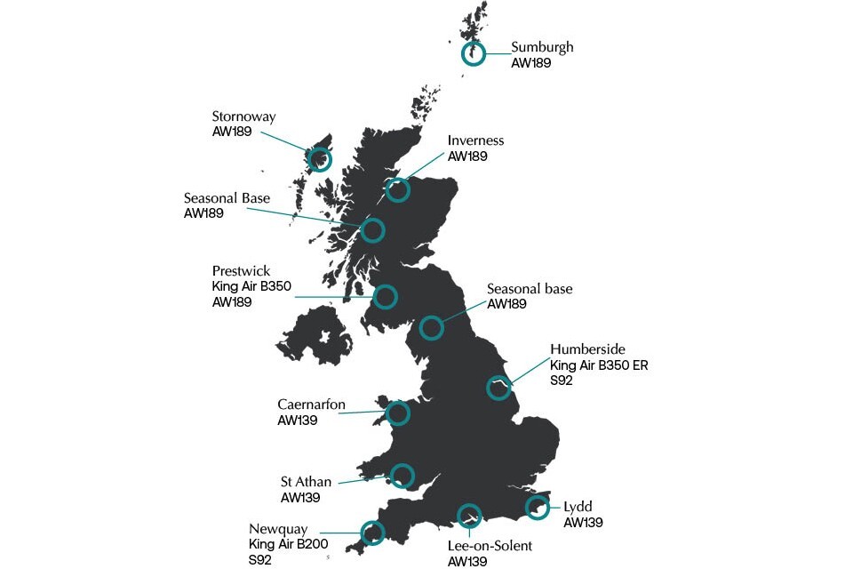 Map of UK with base locations marked: Sumburgh, Inverness, Humberside, Lydd, Lee-on-the-Solent, Newquay, St Athan, Caernarfon, Prestwick, Stornoway.