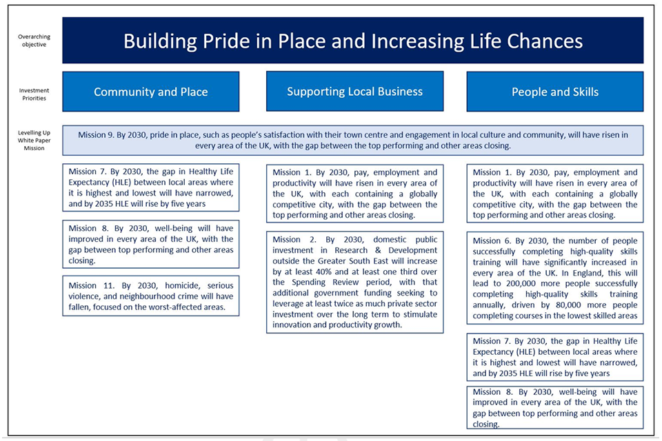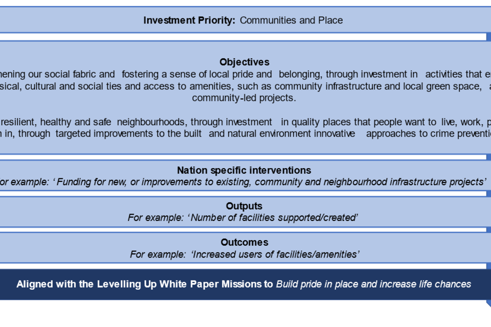 Prif nod yr UKSPF yw meithrin balchder mewn lle a chynyddu cyfleoedd bywyd ledled y DU. Mae hyn yn gyson â chenadaethau’r Papur Gwyn Ffyniant Bro, yn enwedig: ‘Erbyn 2030, bydd balchder mewn lle, fel boddhad pobl â’u canol tref ac ymgysylltiad â diwylliant a chymuned leol, wedi cynyddu ym mhob ardal o’r DU, gyda’r bwlch rhwng yr ardaloedd â’r perfformiad gorau ac ardaloedd eraill yn cau.’