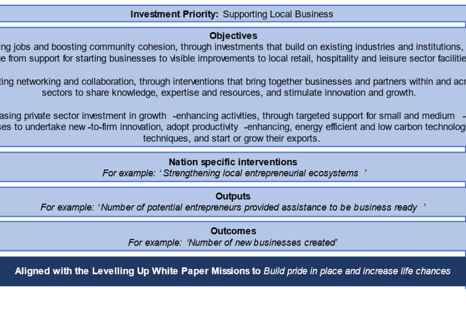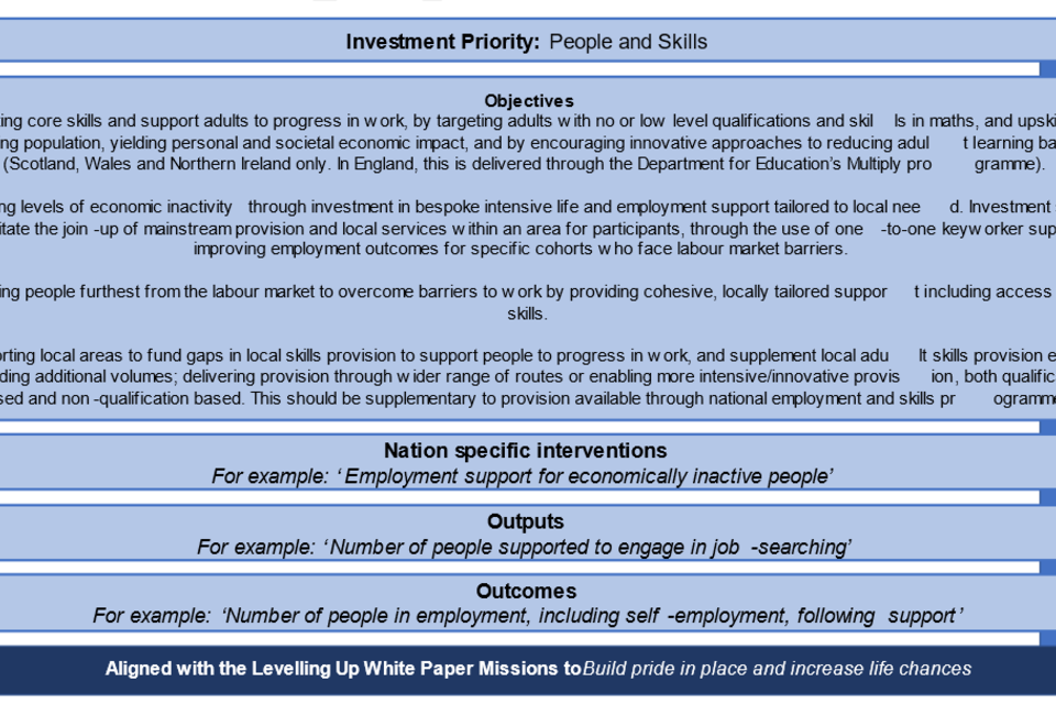 O dan y nod gyffredinol o feithrin balchder mewn lle a chynyddu cyfleoedd bywyd, mae gan yr UKSPF dair blaenoriaeth fuddsoddi: cymunedau a lle; cynorthwyo busnesau lleol; a phobl a sgiliau. Mae amcanion manwl yn gysylltiedig â phob un o’r blaenoriaethau hyn, ac maent yn gyson â chenhadaeth y Papur Gwyn Ffyniant Bro.