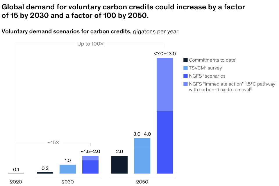 Global demand for voluntary carbon credits could increase by a factor of 15 by 2030 and a factor of 100 by 2050.