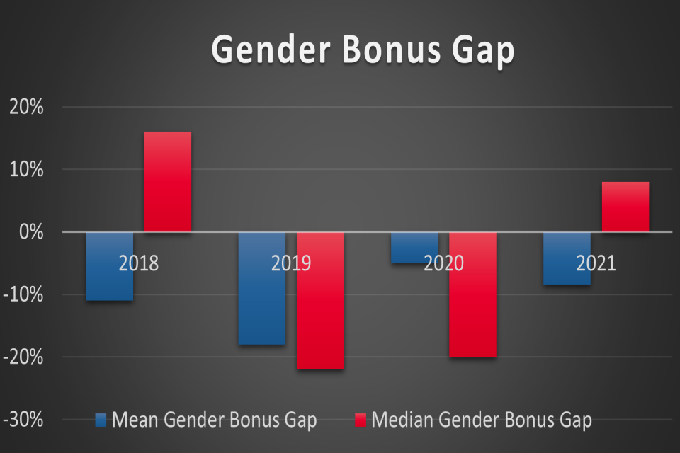 For bonuses, the Gender Bonus Gap for 2021 shows that women were paid higher than men in the mean bonus as has been the case in previous years (-8.4%), but lower in the median (8%). The median bonus gap is strongly influenced by the small numbers receiving a bonus in the higher SCS grades, resulting in a significant increase 28%.