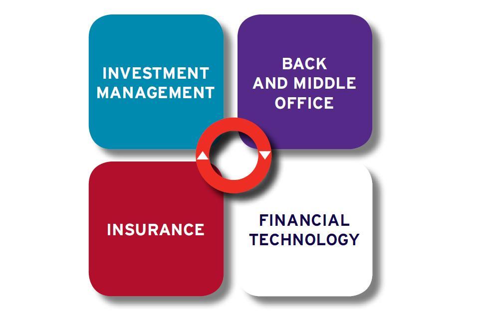 Illustration with 4 financial services related growth areas: investment management, insurance, back and middle office, financial technology, associated professional and business services