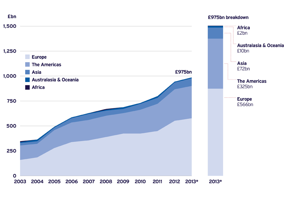 Graph illustration [Sources of UK inward FDI stock by region Source: ONS and UNCTAD. * 2012 ONS source country proportions applied on 2013 UNCTAD estimate (1.6468 US$/£ used, IMF)]