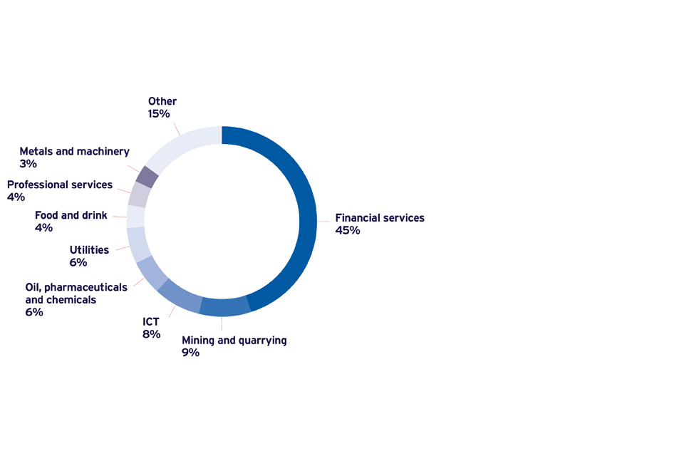 According to the Office for National Statistics (ONS), the UK’s inward FDI stock is spread across a range of industry sectors. The largest concentration is in financial services (45 percent), followed by mining (9 percent), ICT (8 percent) and oil, pharmaceuticals and chemicals (6 percent).